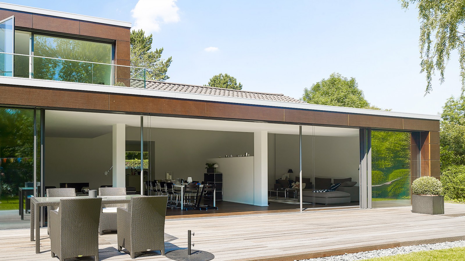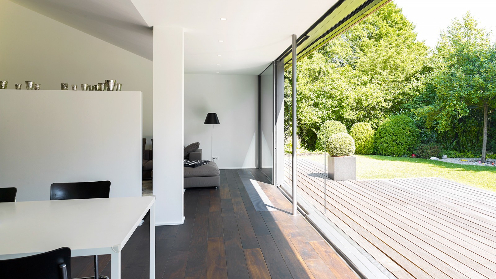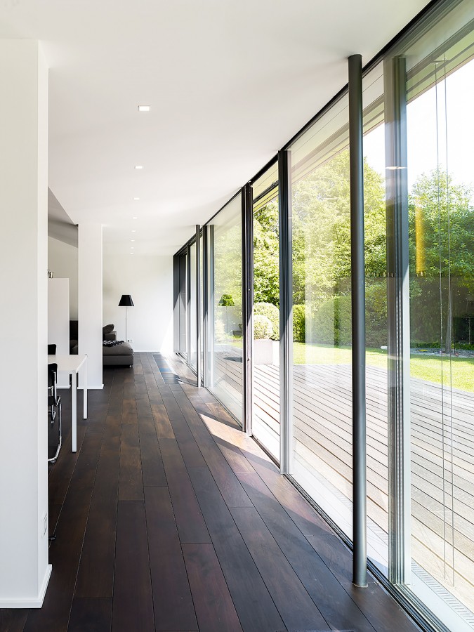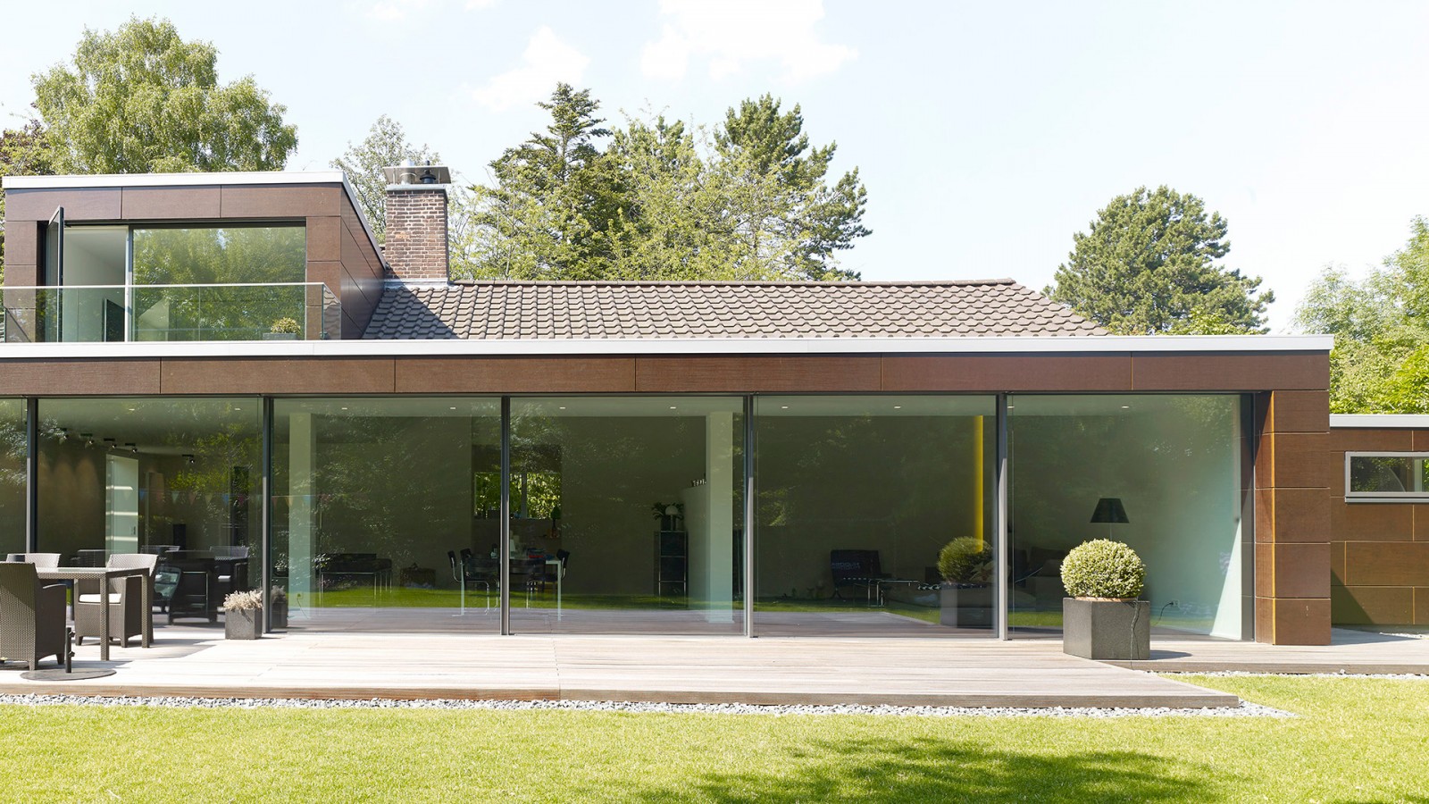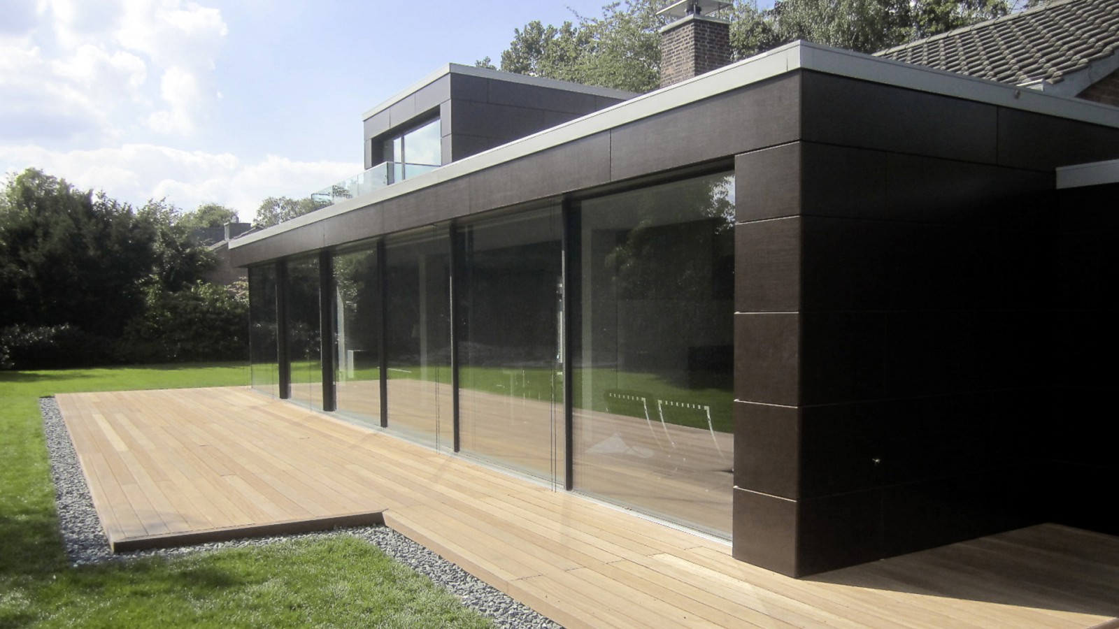 Das bestehende Einfamilienhaus in Hannover-Kirchrode war vor dem Anbau für den Bezug einer Familie mit zwei Kindern, vor allem im Wohnbereich, zu klein. Schnell entstand die Idee einer Erweiterung des Gebäudes in den Garten hinein. Eingesetzt wurde hierbei ein Fassadensystem mit Schiebefenstern. Sind diese komplett geöffnet, ergänzt die großzügige Terrasse den Wohn-, Ess- und Lesebereich in den Garten hinein.