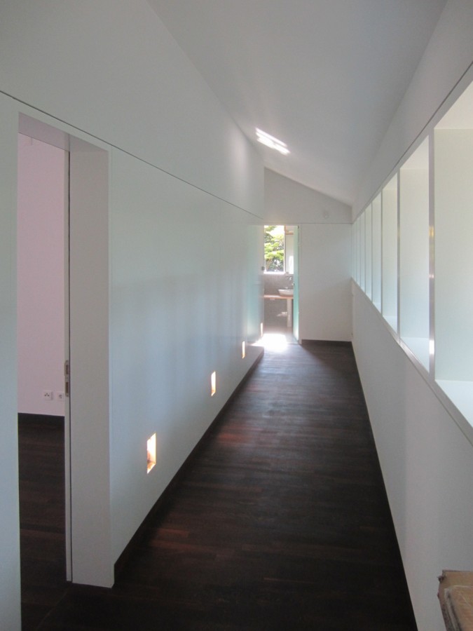 Neben dem Anbau wurden die Küche erneuert, neue Bäder eingebaut und ein Kamin in den Wohn- und Essbereich integriert. Im Neubau dominieren von außen die Materialien Glas und Holz, die einen deutlichen Kontrast zum Bestand darstellen.