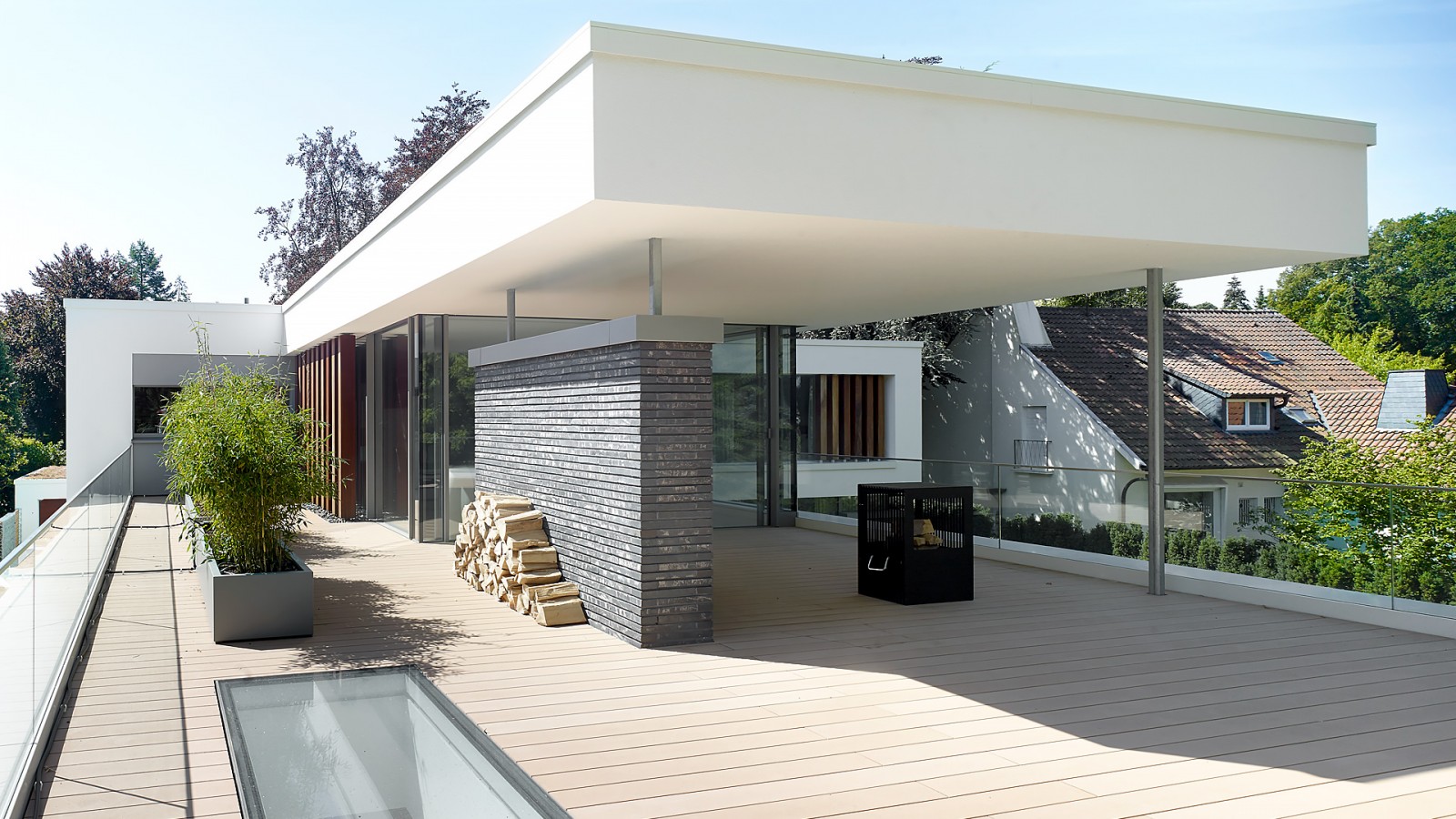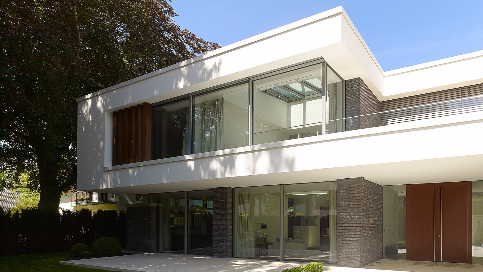 Geprägt wird das Äußere durch die Verwendung von wenigen Materialien. Umlaufende weiße Putzbänder, ein dunkler Klinker, südafrikanische Holzstämme und viel Glas bestimmen das Bild. Innen und außen wurden eingespannte Ganzglasgeländer mit Weißglas eingesetzt. Ein Teil des Obergeschosses „schwebt“ mit Hilfe einer Glasfuge über dem Wohn- und Essbereich.