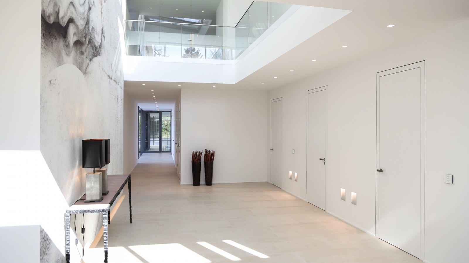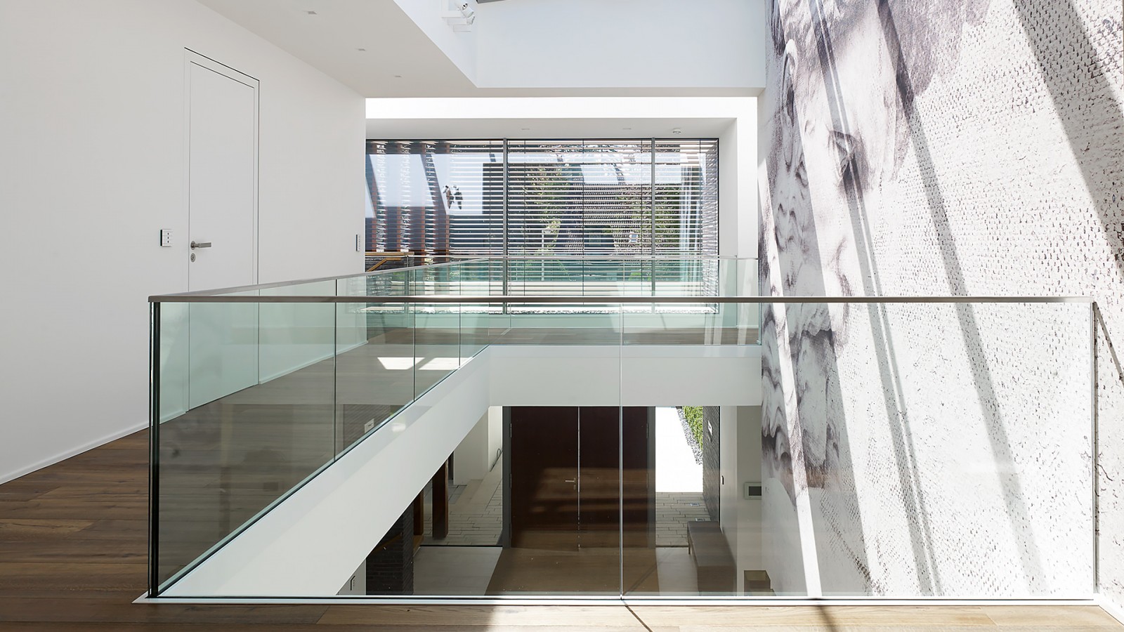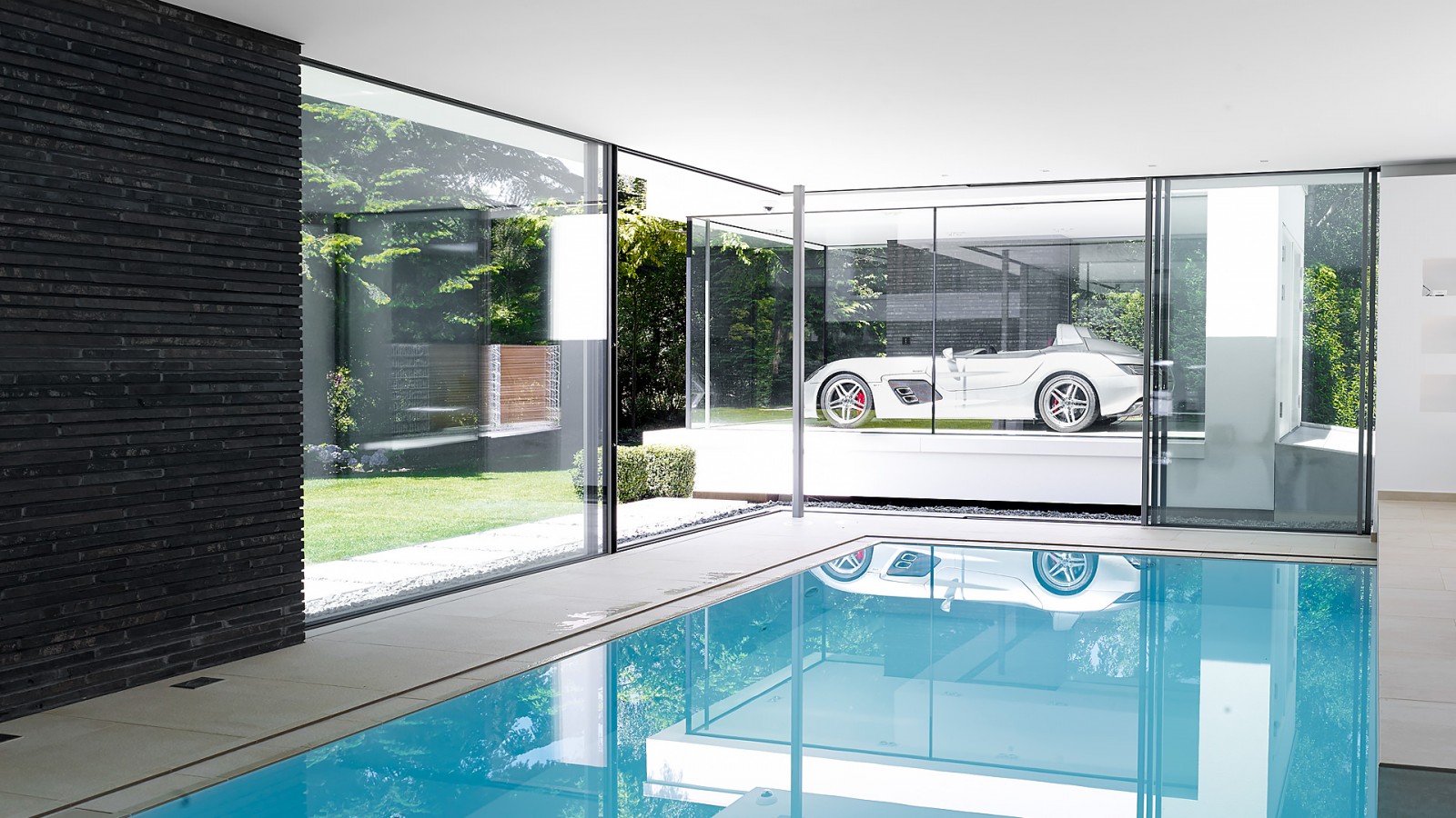 In dem Gebäude integriert sind – neben den notwenigen Räumen eines Einfamilienhauses – eine Tiefgarage, ein Weinkeller, ein Entertain Raum, ein Schwimmbad sowie ein Fitnessraum mit verglaster Sauna. Die Zufahrt zur Tiefgarage erfolgt über eine Doppelgarage, bei der ein Stellplatz als Hubtisch fungiert. Dieser Aufzug befördert den Wagen in die untere Etage und vermeidet so den Eindruck einer langen Zufahrtsrampe.