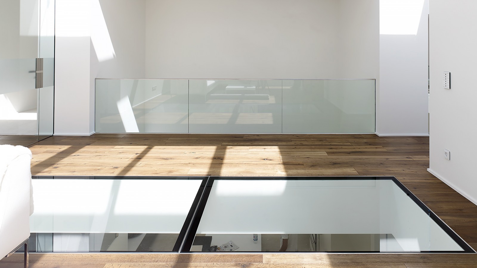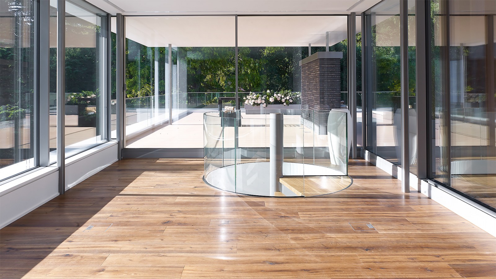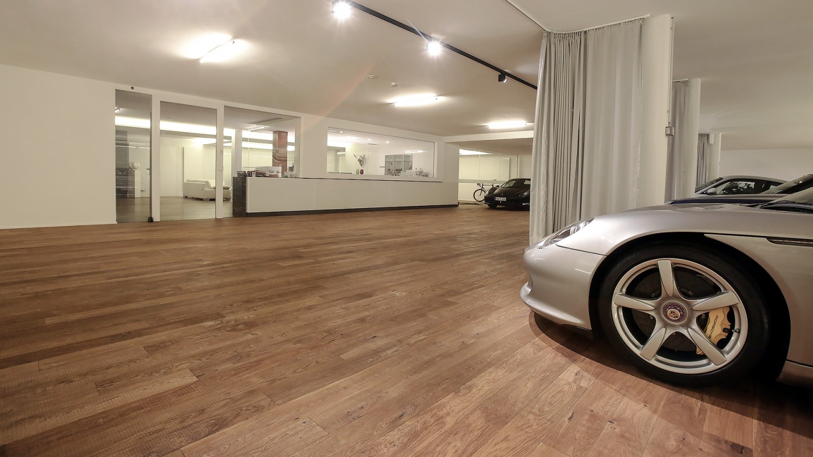 In dem Gebäude integriert sind – neben den notwenigen Räumen eines Einfamilienhauses – eine Tiefgarage, ein Weinkeller, ein Entertain Raum, ein Schwimmbad sowie ein Fitnessraum mit verglaster Sauna. Die Zufahrt zur Tiefgarage erfolgt über eine Doppelgarage, bei der ein Stellplatz als Hubtisch fungiert. Dieser Aufzug befördert den Wagen in die untere Etage und vermeidet so den Eindruck einer langen Zufahrtsrampe.