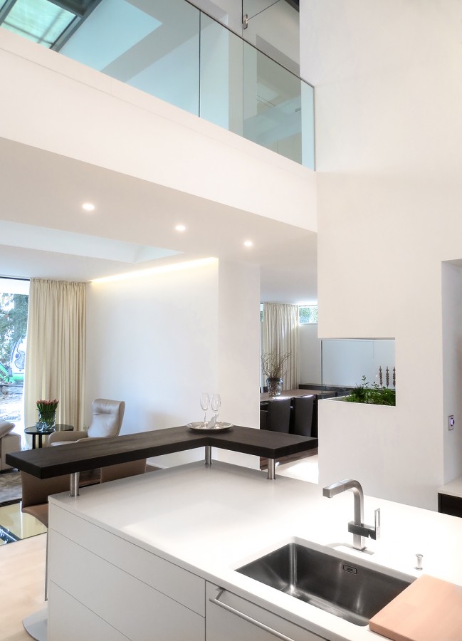Im Inneren betritt man das Gebäude über eine große Eingangshalle, die zweigeschossig ausgeführt wurde und über ein Oberlicht natürlich belichtet ist. Verschiedene Brücken und Glasböden lassen Einblicke zwischen den Etagen zu. Zentrales Element im Gebäude ist die Küche, die durch einen Holz- und einen Gelkamin vom Wohn- und Essbereich getrennt wird. Große, freitragende und helle Räume prägen die Innenarchitektur.