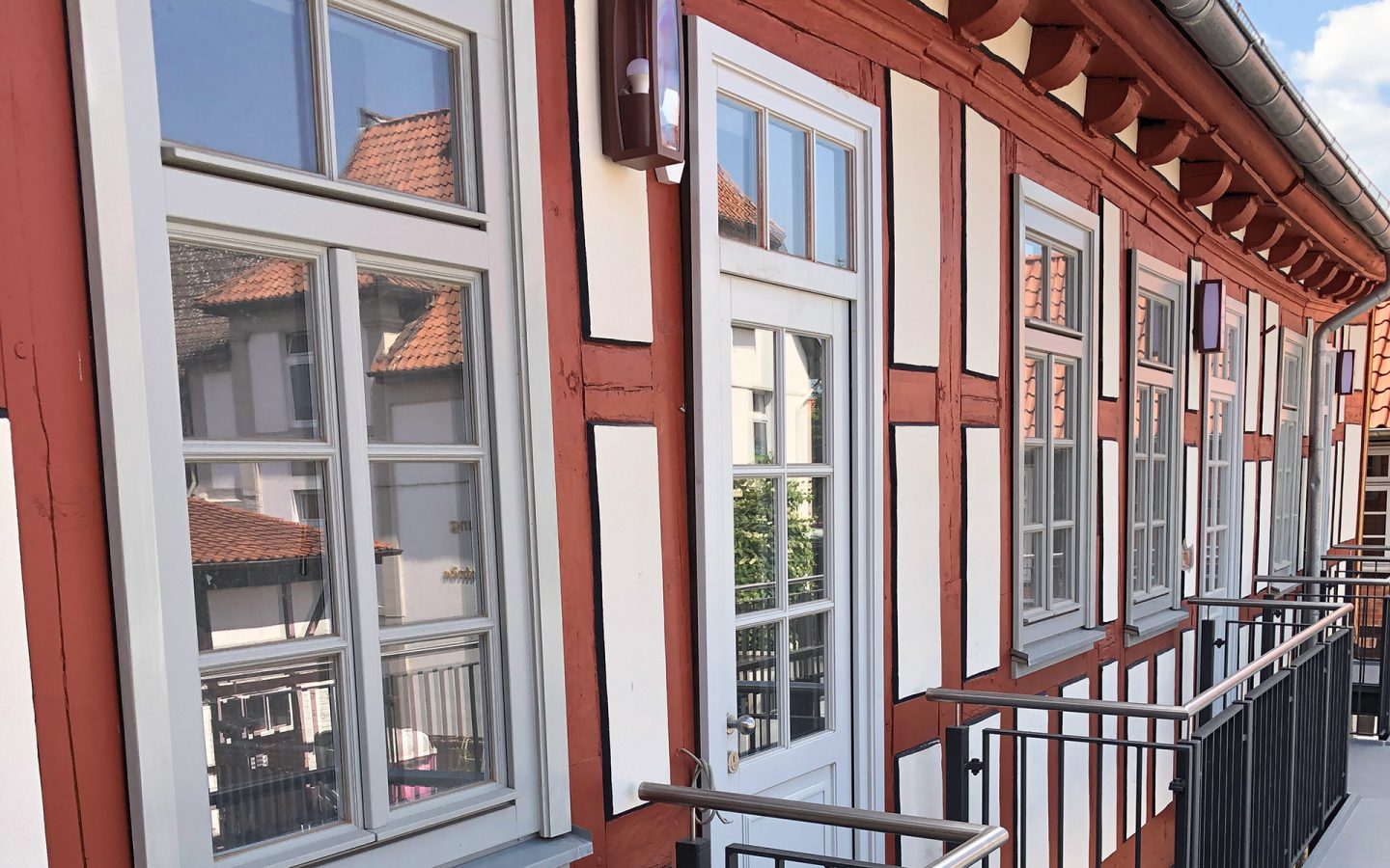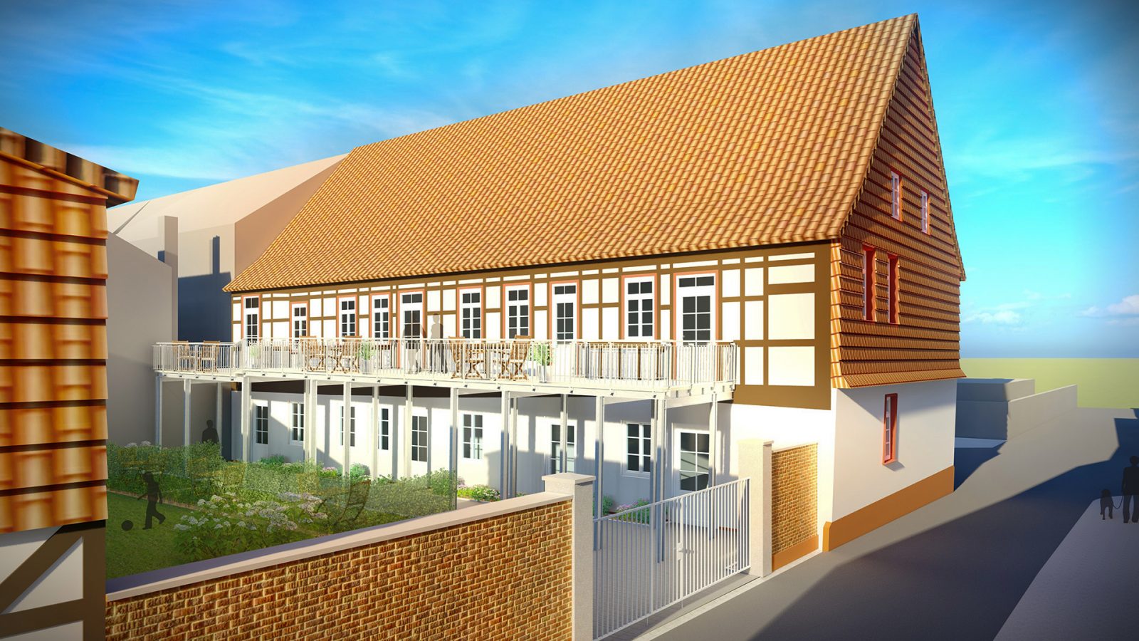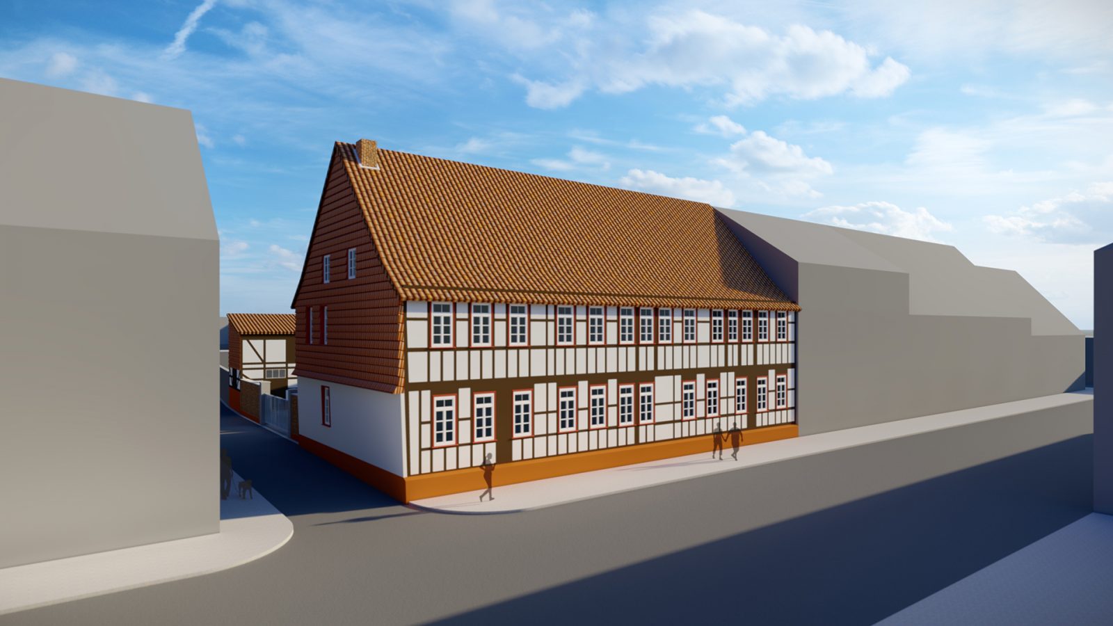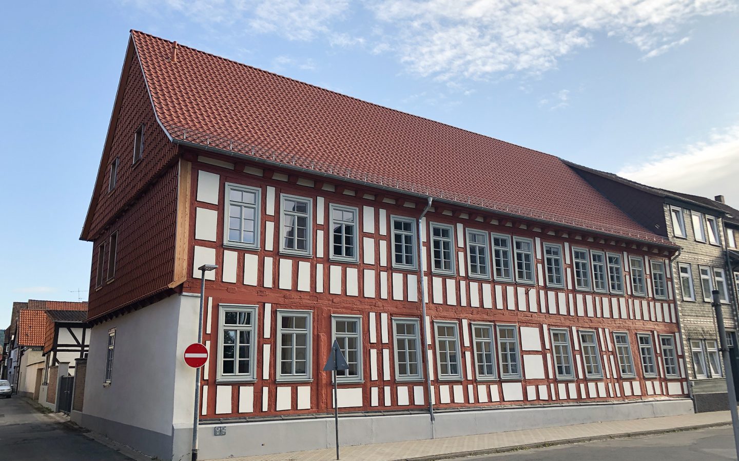 Das unter Denkmalschutz stehende, ehemalige Waisenhaus in der Baustraße in Einbeck war stark sanierungsbedürftig. Der Entwurf zum Umbau und zur Sanierung, des aus dem Anfang des 18. Jh stammenden Gebäudes mit seltenen Leiterfachwerk, sieht den Rückbau des in den 1930er Jahren angebauten Treppenhauses vor.