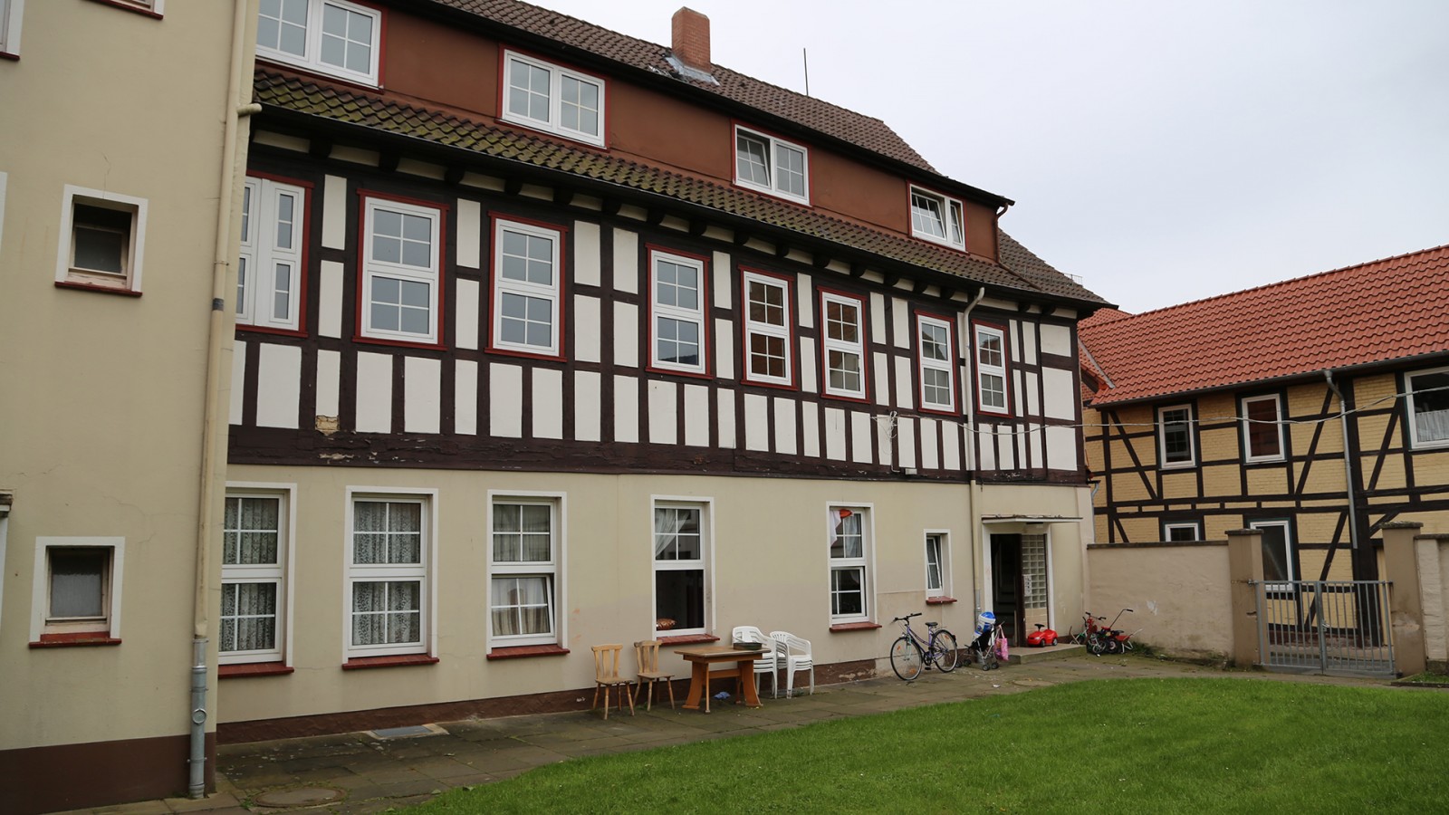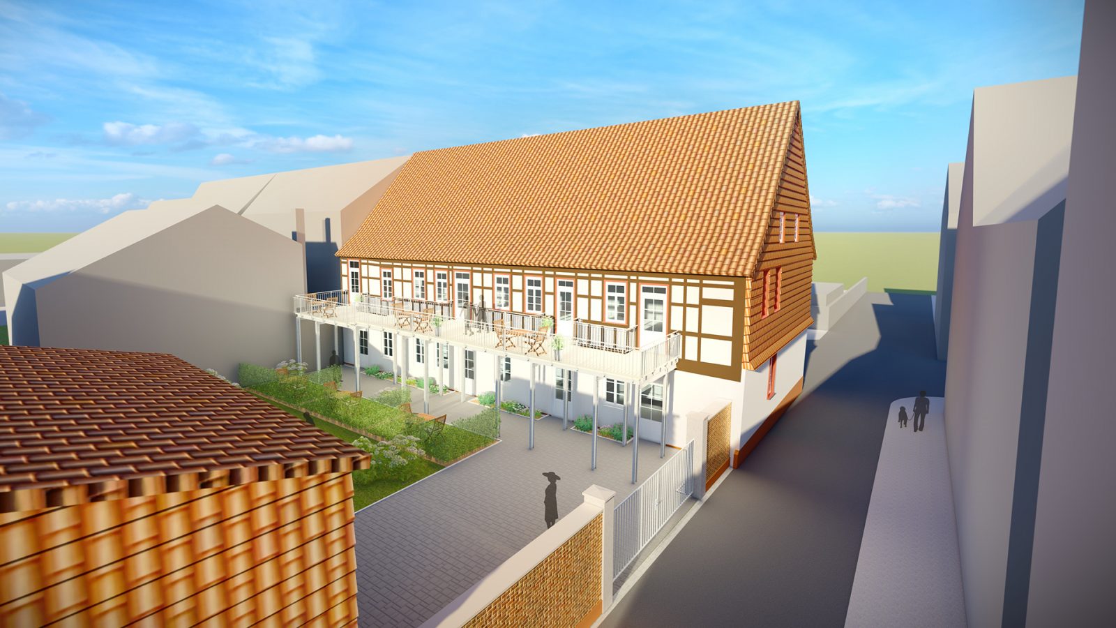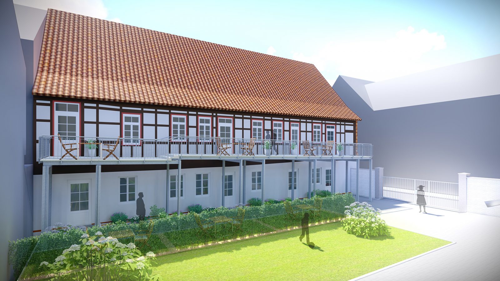 Nach dem Umbau entstehen sechs Wohnungen. Die drei Wohnungen im Erdgeschoss werden direkt von außen über den Hof erschlossen, die Wohnungen im Obergeschoss über ein zentrales Treppenhaus mit einem vorgelagerten Laubengang. Dieser dient den Bewohnern gleichzeitig auch als Aufenthaltsmöglichkeit. Auf den Ausbau des Dachgeschosses wurde aus zwei Gründen verzichtet. Zum einen war in der ursprünglichen Bebauung hier keine Nutzung und somit auch keine Gauben oder Fenster vorhanden, zum zweiten hätte der Umbau der deutlich zu geringen Geschosshöhe einen unzumutbaren Umbauaufwand zur Folge gehabt. Die Gauben werden zurückgebaut und das Dach neu eingedeckt. Die alten Schuppen auf dem Hof werden als Abstellräume für die Wohnungen genutzt.