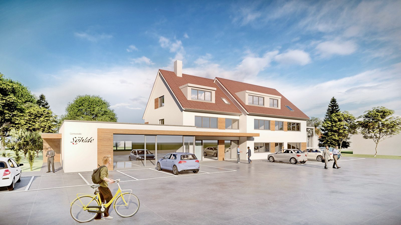 Für die Gemeinde Söhlde planen wir den Umbau des bestehenden Rathauses. Das Gebäude wird umstrukturiert, zudem nicht nur optisch sondern auch brandschutztechnisch und ernergetisch modernisiert. In dem neuen Anbau im Erdgeschoss befindet sich der Sitzungssaal sowie weitere Büroflächen. Ein großzügiges Vordach betont den Eingangsbereich.
