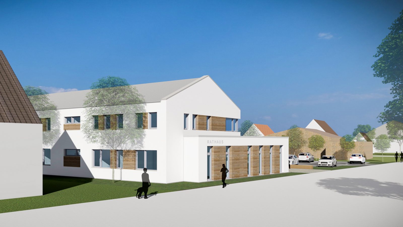 Alternativ zum Umbau wurde ebenfalls die Option eines Neubaus untersucht. Dabei wird der Baukörper so platziert, dass das alte Rathaus während der Bauphase in Betrieb bleiben könnte und erst nach Fertigstellung weichen müsste. Die neue Ausrichtung öffnet hierbei das Grundstück optisch, sodass ein PKW-freier ein Vorplatz entsteht.
