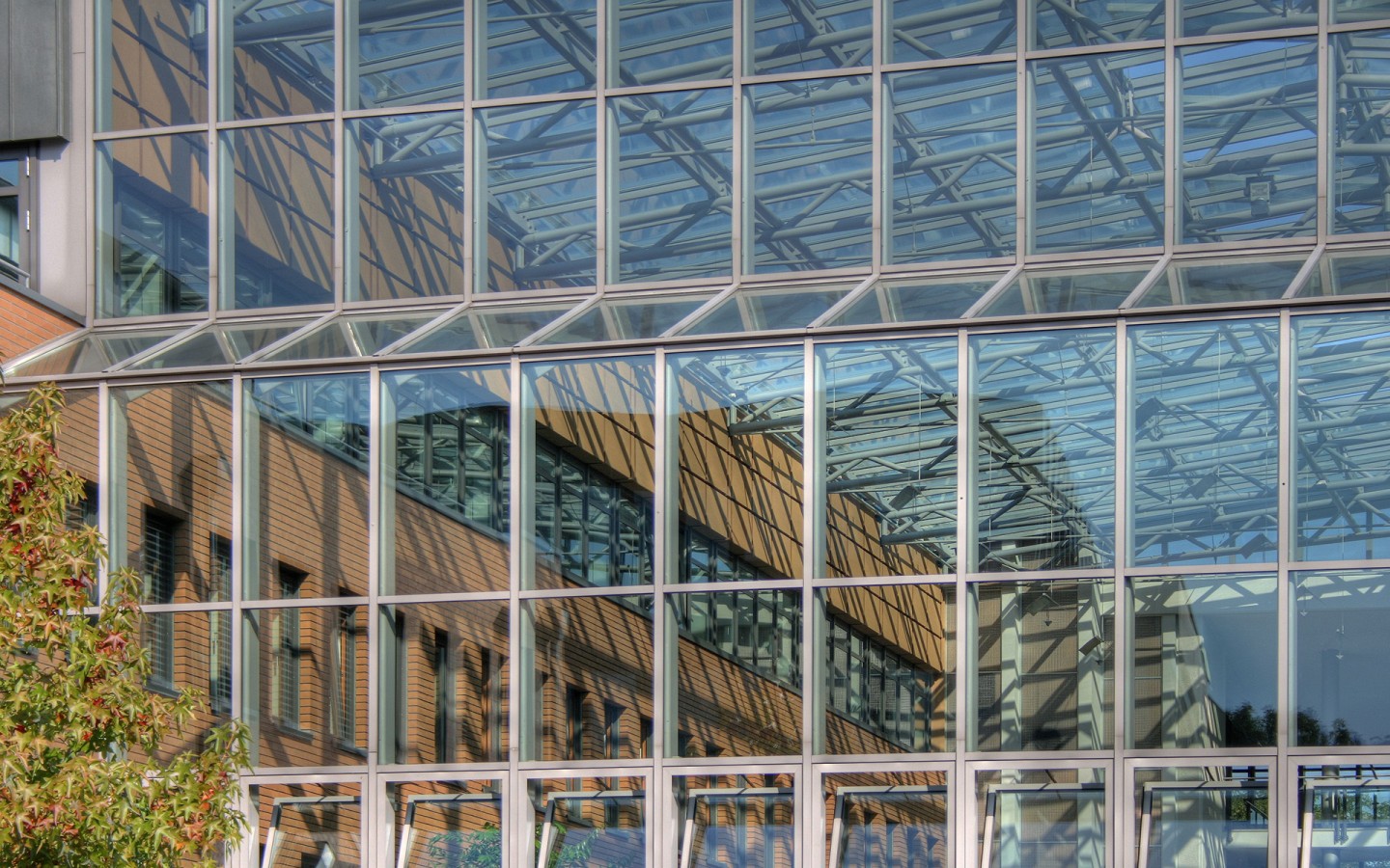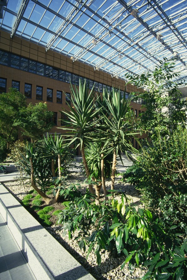 In der Mitte der Gebäudeanlage befindet sich eine 650 m2 große Glashalle, die den Innenbereich prägt. Hier schließen sich Schulungsbereiche mit 112 Schulungsplätzen an. Die Glashalle wurde so geplant, dass interne und kundenorientierte Veranstaltungen stattfinden können. Dies betrifft vor allem die Raumakustik, die Belüftung, die Beleuchtung sowie die Funktionen innerhalb des Gebäudes.